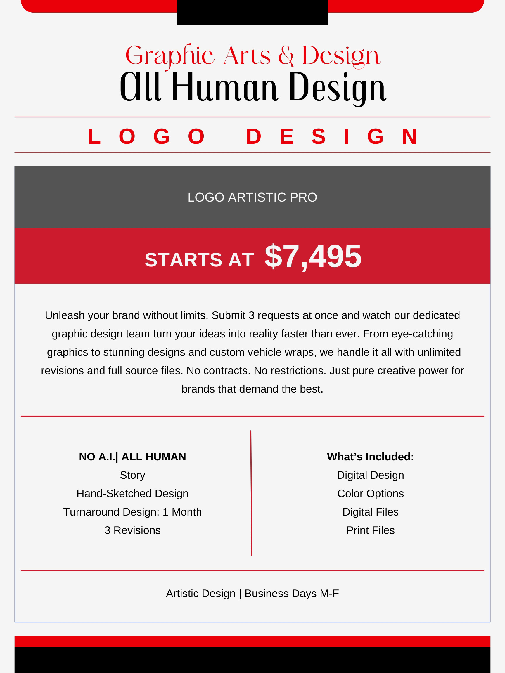 Tell us what you need: logos, social media posts, print designs, or anything in between.